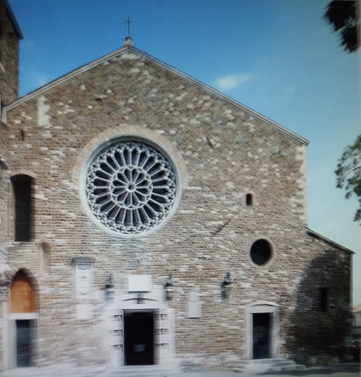 La facciata della cattedrale è piuttosto austera e presenta un enorme rosone di pietra carsica.