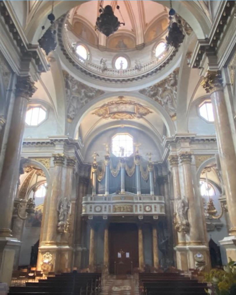 La chiesa sei-settecentesca è caratterizzata da una pianta a croce greca inscritta in un quadrato, sormontato al centro da una cupola, retta da quattro gruppi di pilastri.