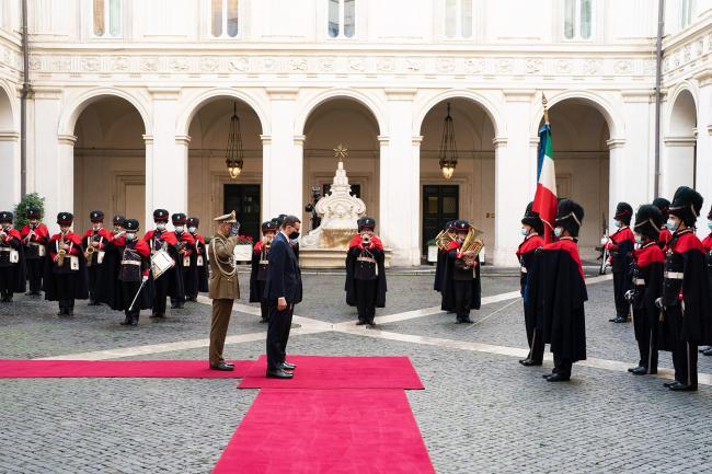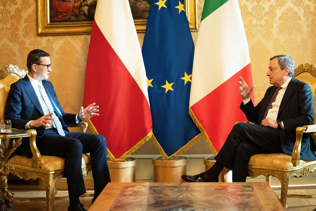 Nel maestoso e storico cortile di Palazzo Chigi il Presidente del Consiglio dei Ministri Mario Draghi ha ricevuto il Primo Ministro della Repubblica di Polonia, Mateusz Morawiecki che entrando nel Palazzo Governativo Italiano è stato accolto , come da tradizione , dalla Banda Musicale dei Bersaglieri. Morawiecki ha omaggiato la bandiera italiana insieme a Draghi e dopo il saluto di rito si sono recati nell’ Ufficio della Presidenza per una referenziale chiacchierata sui problemi dei singoli Paesi .