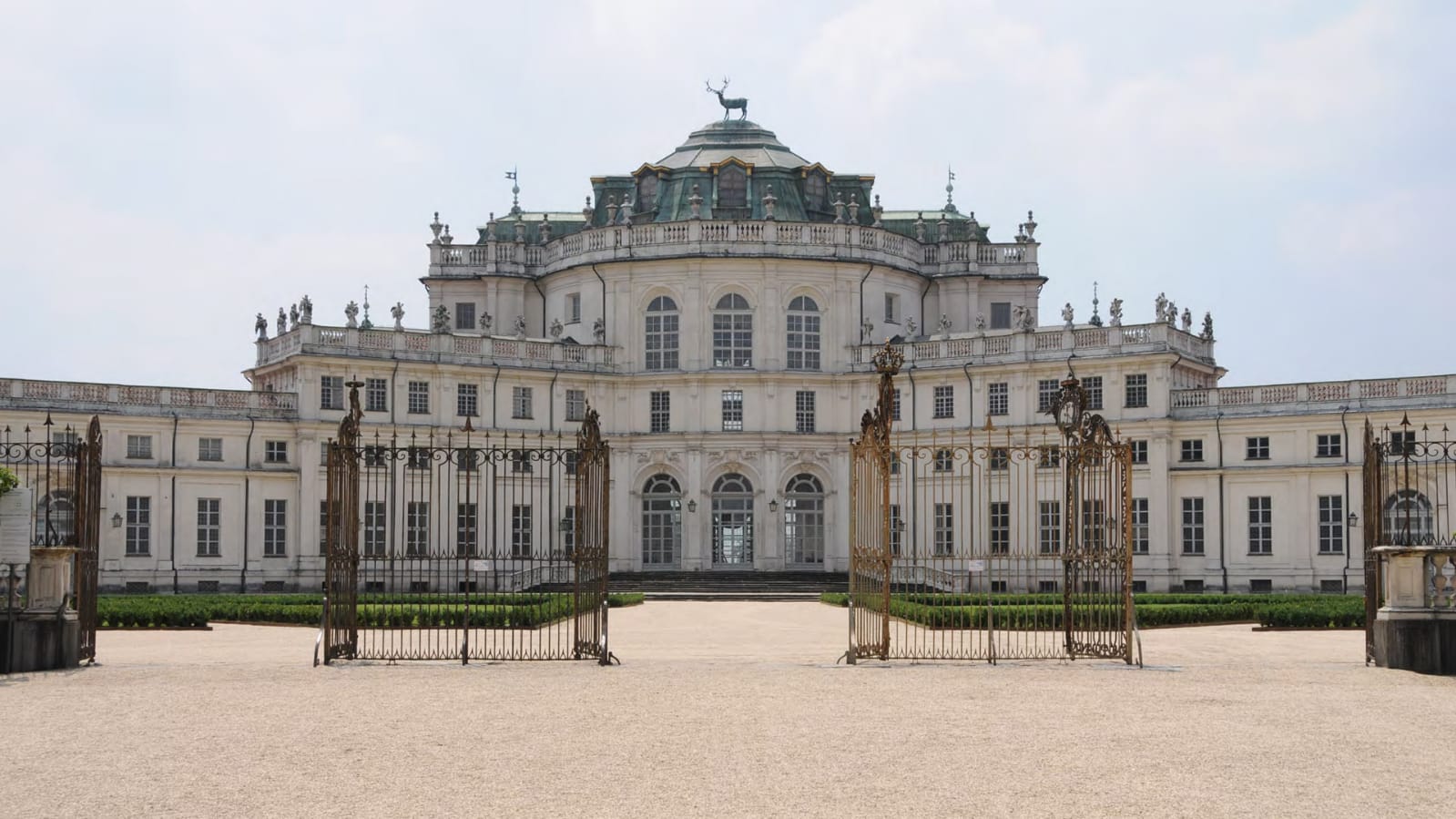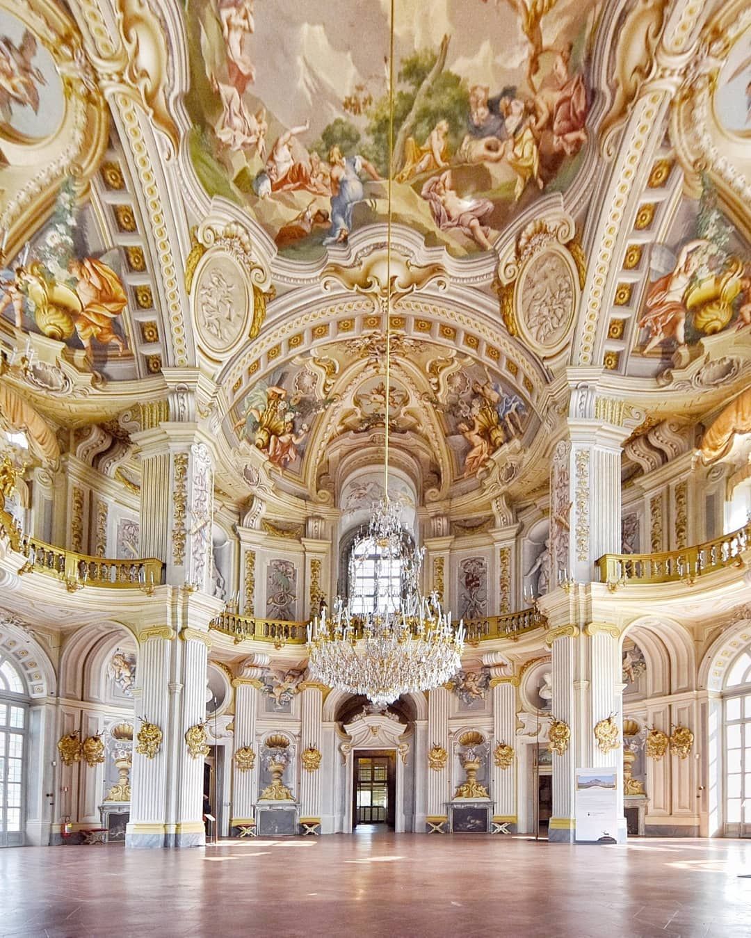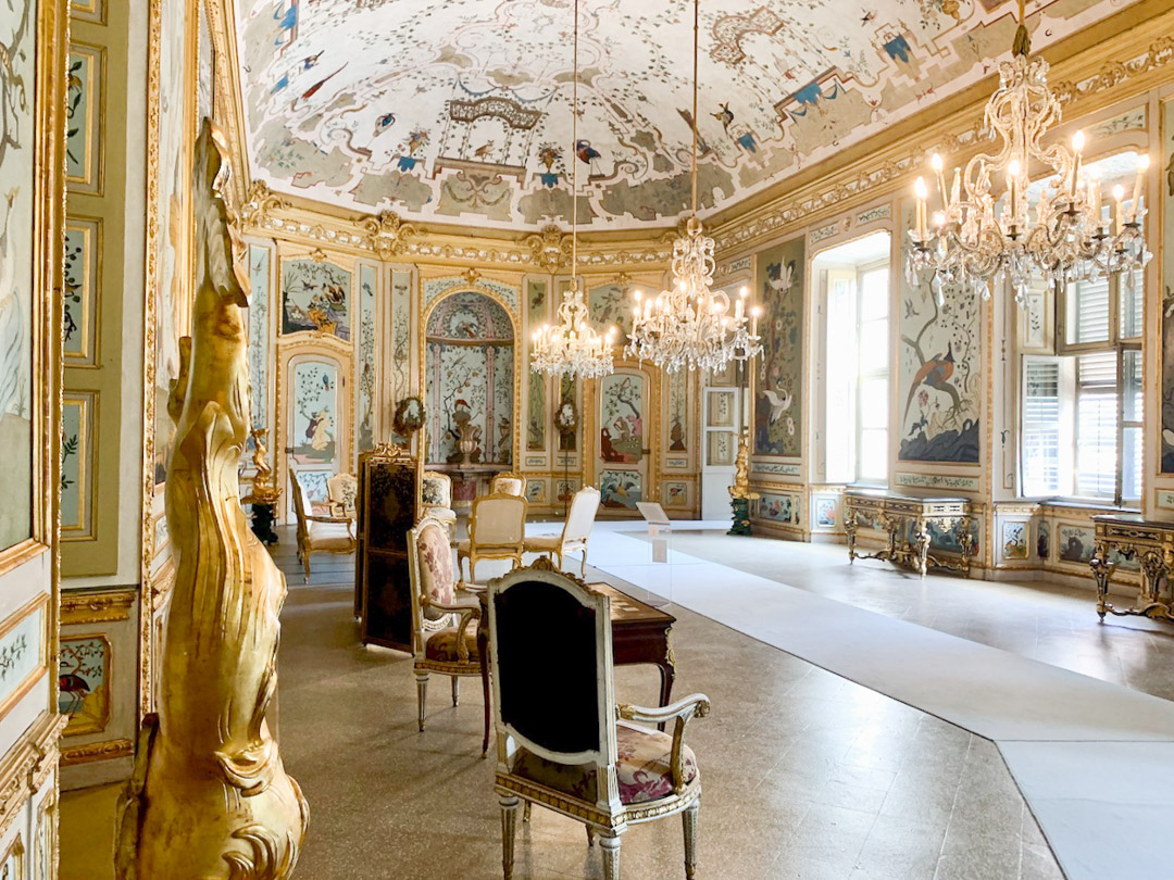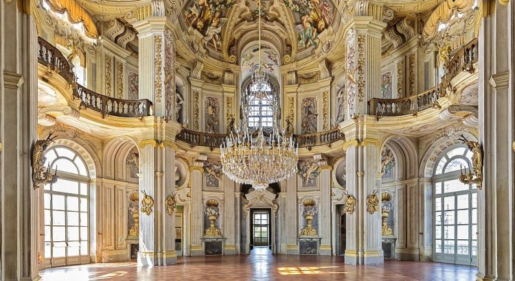 quadri di battute di caccia e numerosi ritratti della famiglia reale. Da questo salone si aprono quattro braccia che conducono agli appartamenti reali e a quelli degli ospiti. Tutto l’interno è un stile barocco riccamente decorato con specchiere, porcellane, mobili e stucchi dorati; vi sono numerose camere e sale come ad esempio la Sala degli Specchi e il Gabinetto di Paolina Bonaparte (sorella di Napoleone), la Sala delle Caccie ( o Saletta del Pregadio) : eccezionale è il Salone Centrale e la mirabile Cappella di Sant’Uberto.