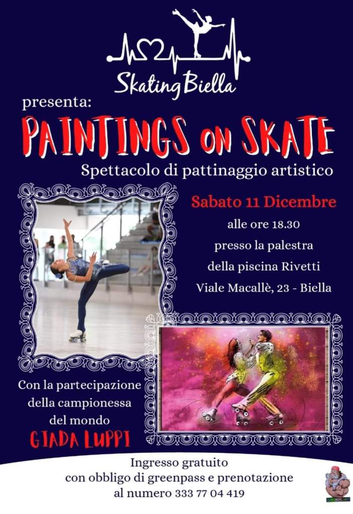 Sarà questa sera , sabato 11 dicembre , alle ore 18.30 presso la Piscina Rivetti ma per ragioni legate alle regole anti Covid nei giorni scorsi si è dovuto procedere con la prenotazione degli spalti via messaggio whatsapp. Ci saranno altre giornate dove il pubblico potrà partecipare Intanto questa sera vi sarà l’esibizione agonistica di Skating Biella con un folto numero di iscritti della Gio.Ka con la quale il sodalizio biellese collabora. Sarà presente anche la campionessa mondiale di categoria che intratterà anche i presenti con balletti agonistici per rendere omaggio al momento agonistico. Salvo diversi impegni sportivi vi sarà anche Enzo Salerno, atleta italiano, oggi allenatore della Nazionale di Pattinaggio Mondiale.