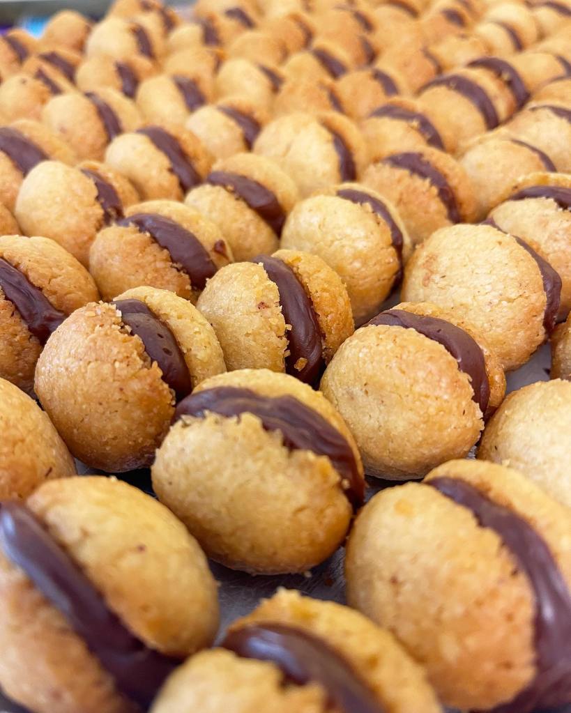 semisfere di pasta unite dal cioccolato che sembrano due labbra che stanno per baciarsi.