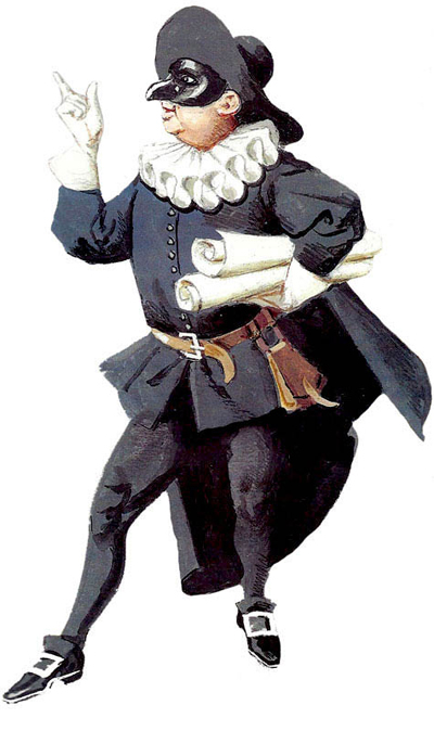 un noioso avvocato che parla in lingua “maccheronica”. Si veste di nero coperto da un