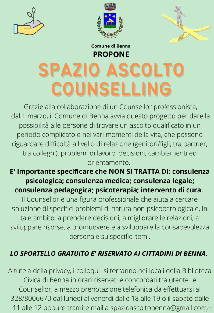 BENNA – Dal 1 marzo, grazie alla collaborazione di un Counsellor professionista, il Comune avvierà un progetto di “Spazio Ascolto Counselling”, un posto dove le persone potranno trovare un ascolto qualificato e non giudicante in un periodo complicato e nei vari momenti della vita che possono riguardare difficoltà, decisioni da prendere, cambiamenti da affrontare, orientamento.