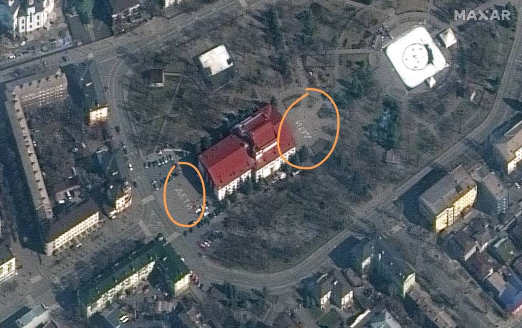 L’azienda statunitense di satelliti Maxar Technologies ha distribuito delle immagini satellitari che mostrano come nel cortile del teatro di Mariupol, bombardato oggi dalle forze russe, fosse stata dipinta la scritta “bambini”. L’azienda ha annunciato la distribuzione di nuove immagini, non appena queste saranno disponibili.