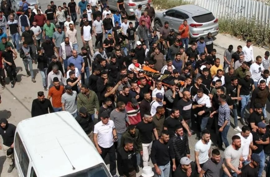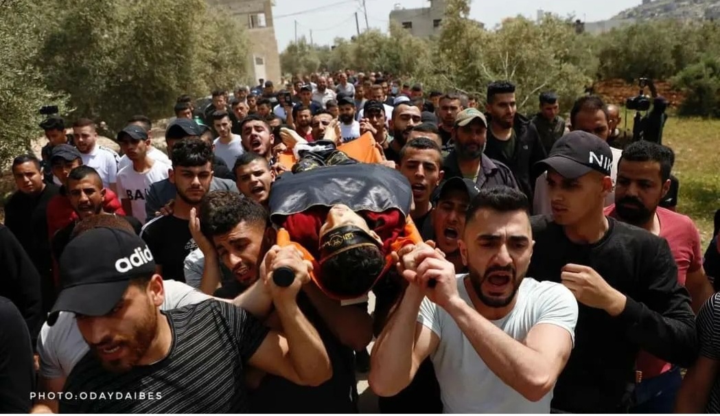 -Foto del momento in cui le forze di occupazione israeliane hanno ucciso il giovane palestinese Ahmad Massad (18 anni) durante il ritiro delle forze dalla città di Jenin, questa mattina. 27.4.2022 con a seguire quelle del funerale.