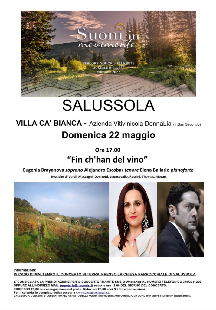 Domani sera , domenica 22 maggio, a Salussola, paesino biellese conosciuto in Italia e nella sua storia per il suo eccidio, verrà organizzato un interessante concerto musicale con Eugenia Brayanova soprano , Alejandro Escobar tenore ed Elena Ballario pianoforte.