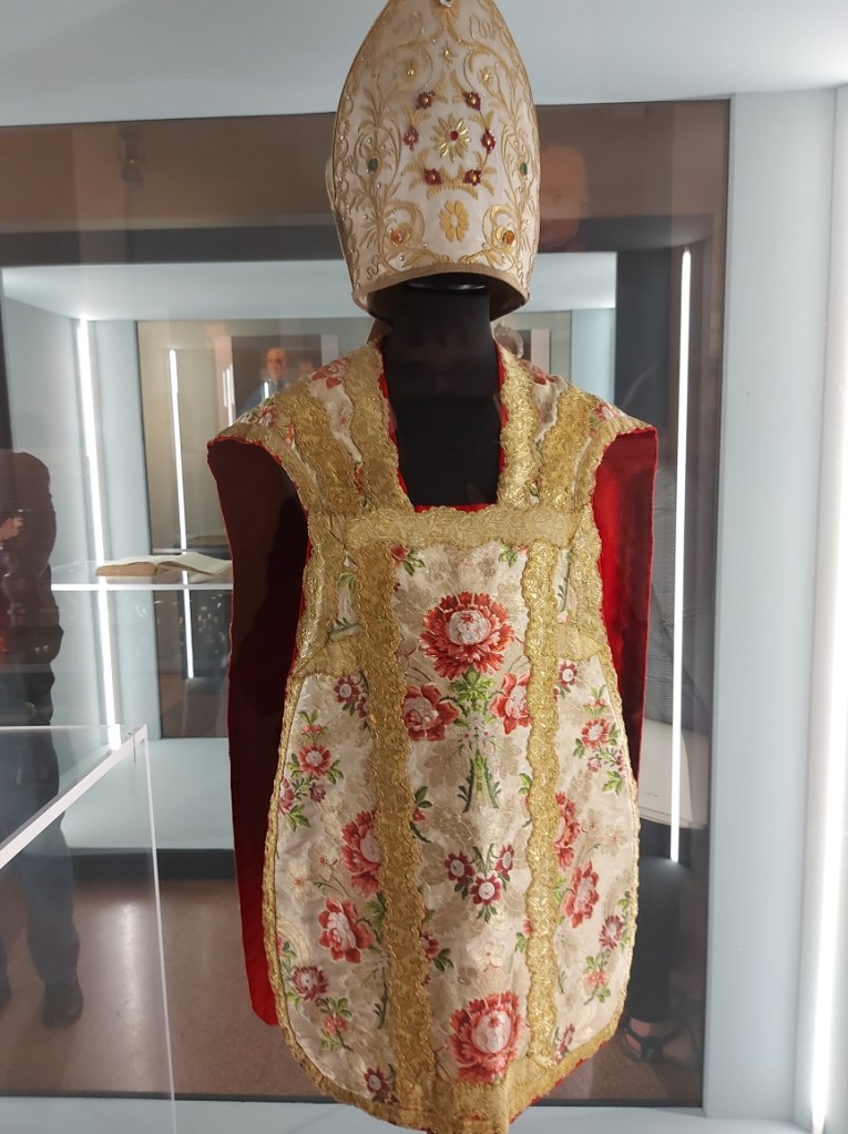 Successivamente è venuto il turno del vescovo di Biella, Monsignor Roberto Farinella, che ha esordito dicendo che la mostra ci permette di fare un percorso nel tempo, per valorizzare la storia della nostra Chiesa locale; ha poi sottolineato che la storia della Chiesa biellese è iniziata molti secoli prima dell’istituzione della Diocesi; quest’ultimo evento avvenne proprio il 1 giugno del 1772, con la bolla firmata da papa Clemente XIV. Questa bolla fu poi portata a Torino per il riconoscimento regio. La bolla racconta in maniera significativa la situazione biellese del tempo: le località che c’erano, le pievi… Il vescovo ha poi annunciato un evento di preghiera per sabato 4 giugno (la sera prima di Pentecoste) in piazza Duomo, nel quale affideremo al Signore il nostro cammino che va avanti. La mostra ci riporta alle radici della nostra fede e della nostra identità cristiana; ci riporta ai motivi che hanno portato alla nascita della nostra Diocesi. In conclusione Monsignor Farinella ha invitato a visitare la mostra con uno sguardo “intelligente”, cioè che legge dentro, che va oltre la materialità degli oggetti.