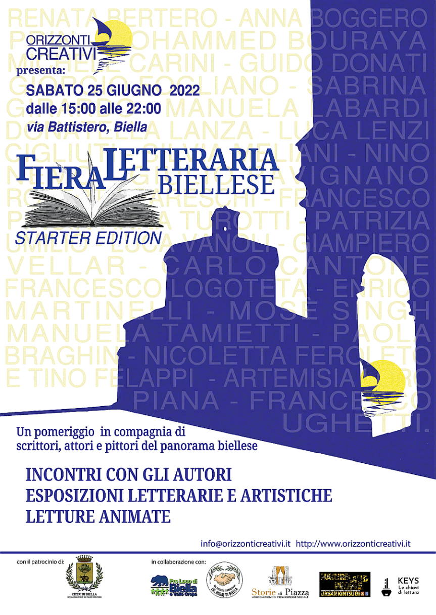 La Fiera letteraria aprirà i battenti dalle ore 15 alle ore 22.00 e oltre a Orizzonti Creativi hanno partecipato per la sua realizzazione l’associazione culturale islamica Al-Huda , Pro loco di Biella, Storie di Piazza , Urben Kitsugi e keys le chiavi della lettura.