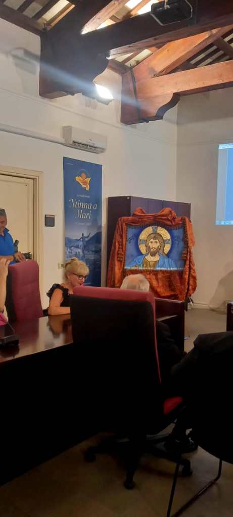 l’immagine sacra del Santissimo Salvatore le ha creato una grande emozione, l’ispirazione le ha guidato la mano. Ha utilizzato colori acrilici che permettono rapidità di esecuzione, colori per i tessuti e foglia d’oro. «A noi artisti è affidato il compito di divulgare la bellezza, un dono che richiede responsabilità e impegno». Angelo Rosso spiega come si ritenesse che la “’Ntinna a mari” si fosse originata nel 1783, «l’anno del terremoto che distrusse la Sicilia»,