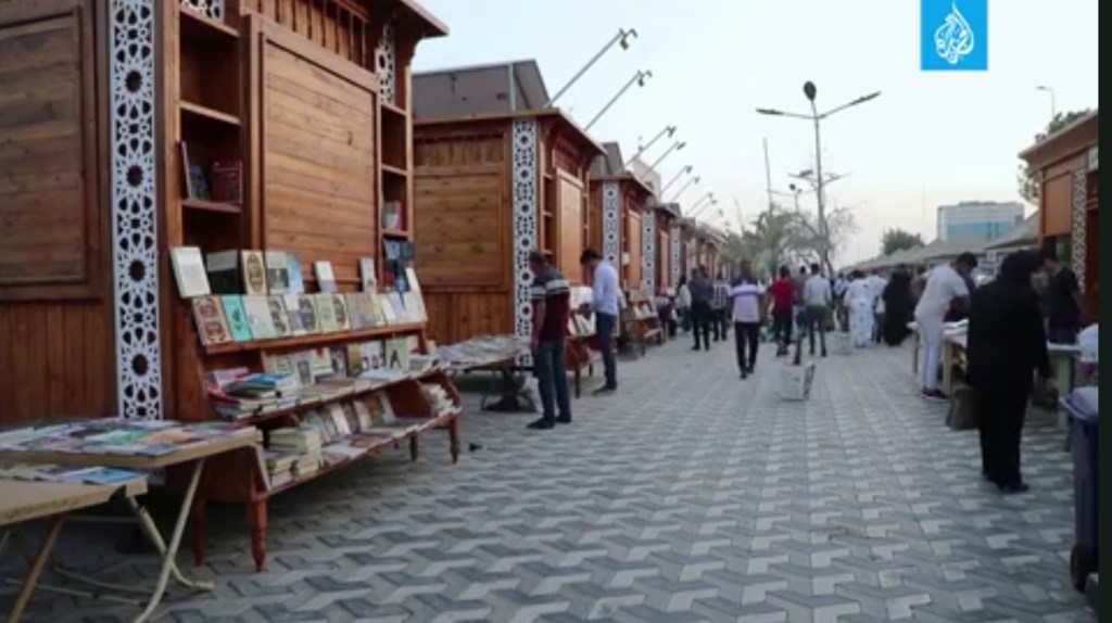 Sulla Via della Cultura e del Libro Al Farahidi che si è sviluppata in questi giorni, gli amanti della lettura e i passanti possono ora godere di una serie di bancarelle di libri in legno, illuminazione esterna e marciapiedi che aggiungono bellezza alla passeggiata culturale nella città di Bassora in sud dell’Iraq.