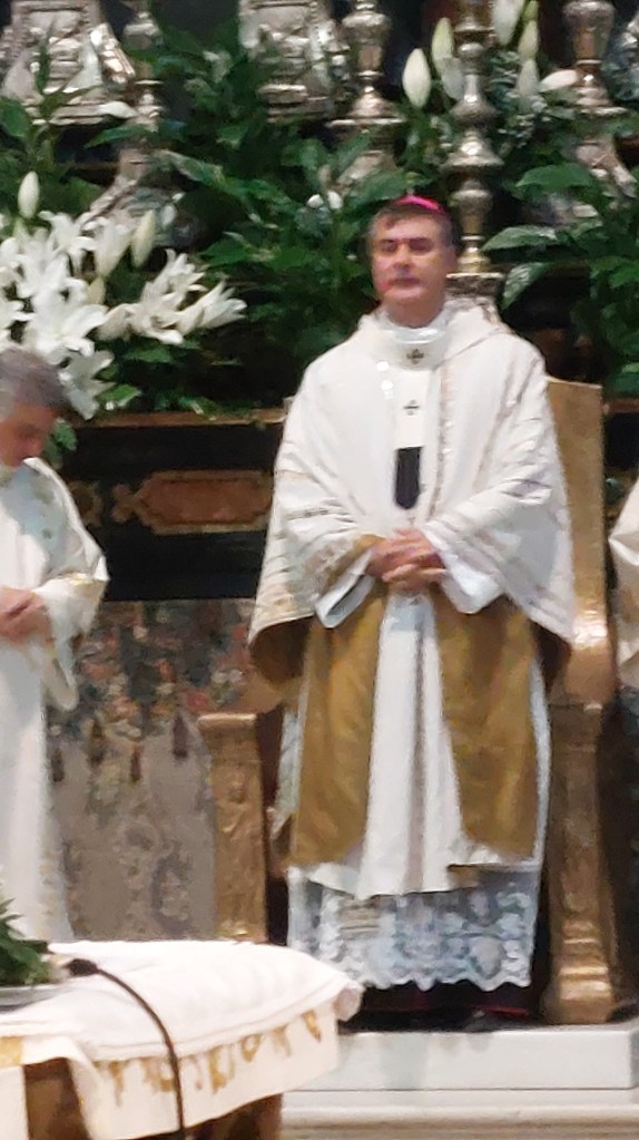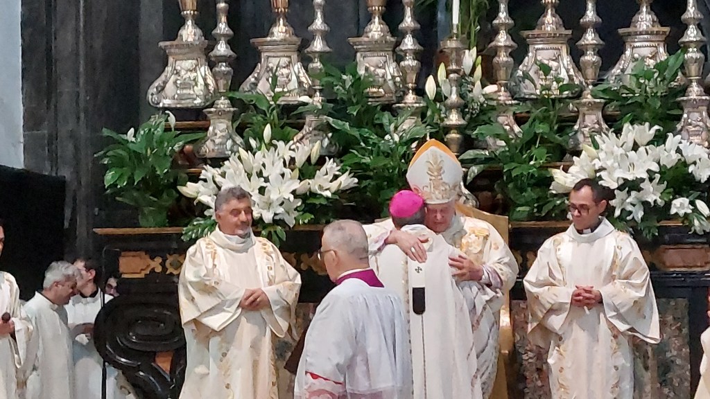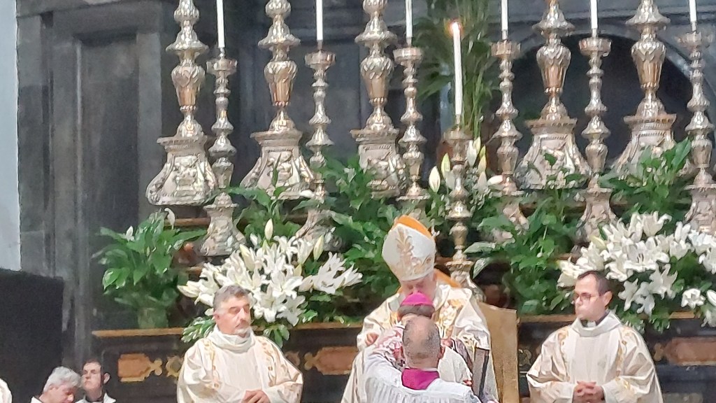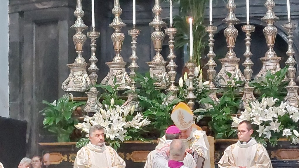 Il gesto dell’imposizione del Pallio si è tenuto in un clima molto familiare proprio grazie alle parole di affetto del Nunzio Apostolico subito dopo il segno di croce . Di seguito la celebrazione eucaristica è proseguita con i consueti canoni liturgici.