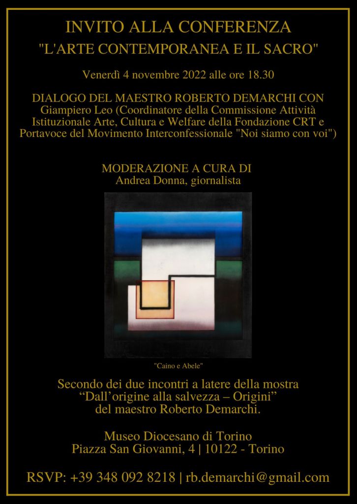 Seconda e ultima conferenza del mini ciclo “L’arte contemporanea e il sacro”: venerdì prossimi (4 novembre, ore 18.30) Giampiero Leo, Coordinatore della Commissione Attività Istituzionale Arte, Cultura e Welfare della Fondazione CRT e portavoce del Movimento Interconfessionale “Noi siamo con Voi” e il maestro Roberto Demarchi discuteranno del rapporto presente tra l’arte contemporanea e il sacro e se sia ancora possibile una pittura di tema sacro nella nostra contemporaneità.