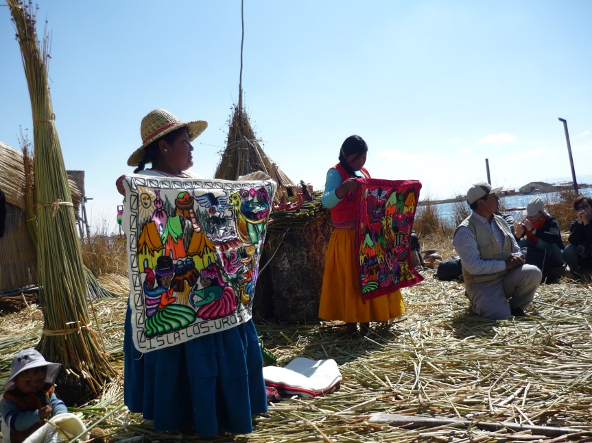 Iniziamo il giro del lago visitando le “isole” galleggianti degli Uros, in realtà non sono vere e proprie isole ma zattere composte di canne ormeggiate con pali su cui vivono le popolazioni Aymara.
