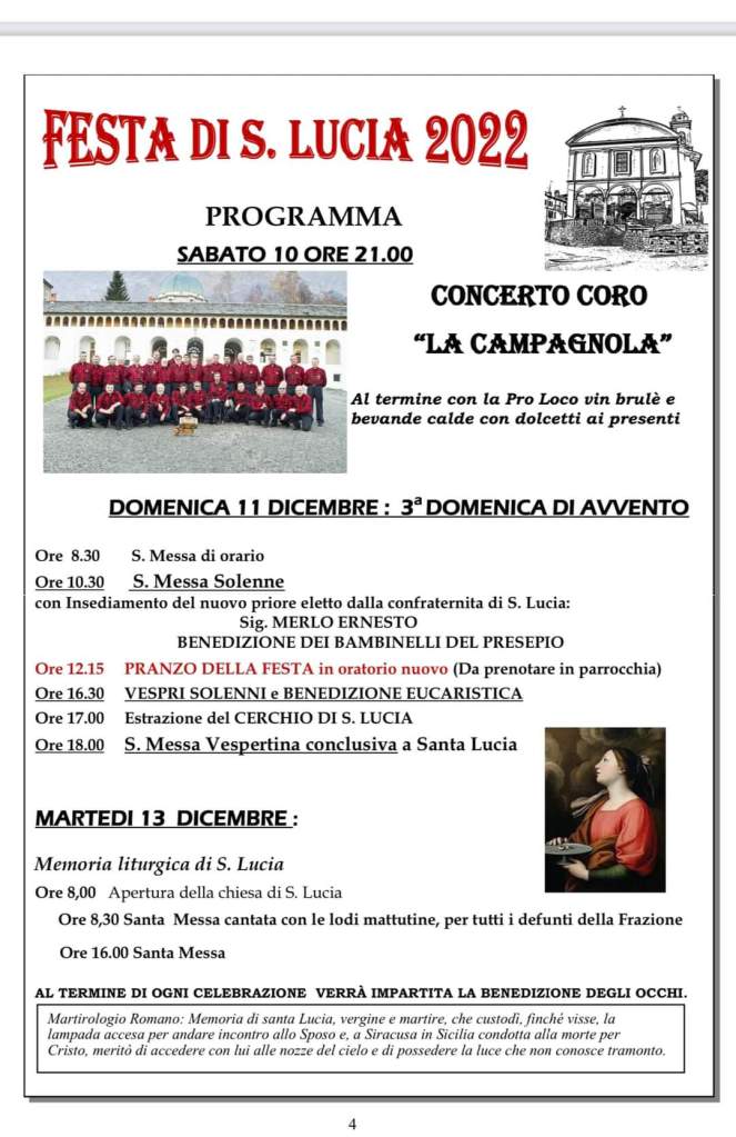 Infine alle ore 17.00 l’estrazione della lotteria del Cerchio di Santa Lucia con la Santa Messa Vespertina delle ore 18.00