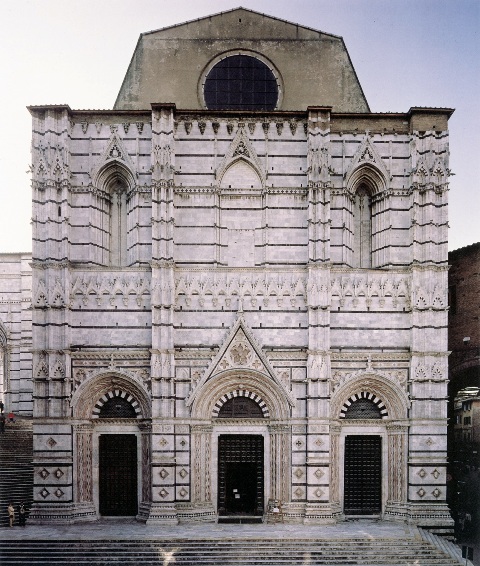 rivestimento bicromo, con una volta azzurra, punteggiata da stelle. Prezioso il pavimento riccamente decorato del periodo tra XIV e XVI secolo, la maestosa Cappella Chigi del 1660 di Giovanni Lorenzo Bernini ( scultore, pittore ed architetto napoletano di fine 500), sei colonne che reggono le statue dei Santi Protettori della città; il pulpito del 200 è sorretto da leoni e leonesse, l’altare del 500 con due splendidi angeli portacandelabri. Nell’abside , oltre a un notevole coro, si trova una delle più antiche vetrate italiane e gli specchi del pulpito illustrano la vita di Gesù in stile romanico.