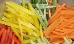 Buongiorno, oggi voglio preparavi una ricetta un po’ orientale alla mia maniera. Prepariamo sempre per 4 persone ingredienti verdure 1 carota, 1 pezzettino di zenzero,1 pezzo di daikon pari a una carota ( il daikon è quel carotone bianco), 1 pezzo di peperone rosso oppure giallo o entrambi, 1 zucchino, è un po’ di cavolo bianco, 1 porro non tanto grosso,dei gamberi se possibile interi perché con le teste e il guscio faremo un brodo , in alternativa si può usare del petto di pollo, o mettere entrambi . Bene ora iniziamo a lavare le nostre verdure e pelare le carote e il daikon poi tagliamo tutte le verdure a julienne .