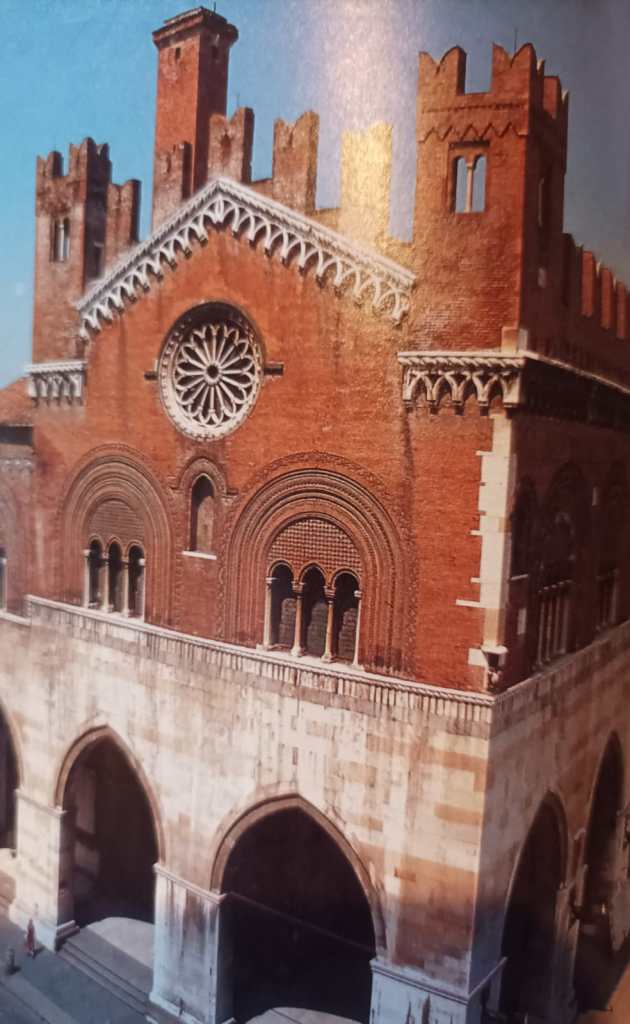 Eretto a fine 200 in stile lombardo – gotico, esempio tra i più interessanti edifici civili in Italia. Su un alto basamento marmoreo, aperto da una loggia, si trova il piano superiore traforato da trifore e al