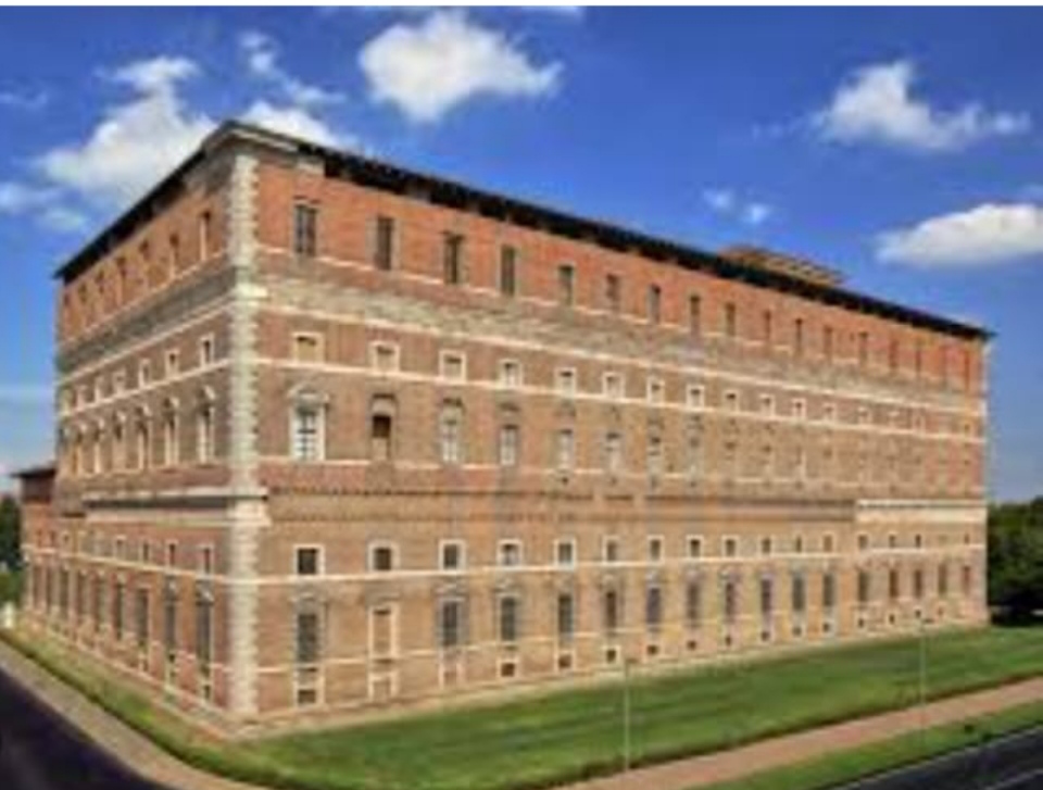 di sopra una serie di merli ghibellini a coda di rondine. Il Palazzo domina Piazza Cavalli.