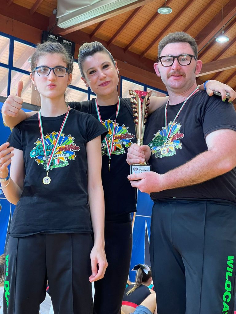 La prima è stata l’esordio assoluto di una compagine di Paracheer ad una gara di livello nazionale, con i Wildcats Dreams, sia nel Cheerleading che nel Cheerdance. Luca, Marta e Roberta, che per la prima volta nella storia del Paracheer del nostro paese hanno partecipato ad un evento competitivo ad aprile in occasione della Monterosa Valsesia Cup, hanno nuovamente gareggiato capitanati dalla coach e direttore tecnico della Gym&Cheer Silvia Zanolo, che è salita in pedana con loro.