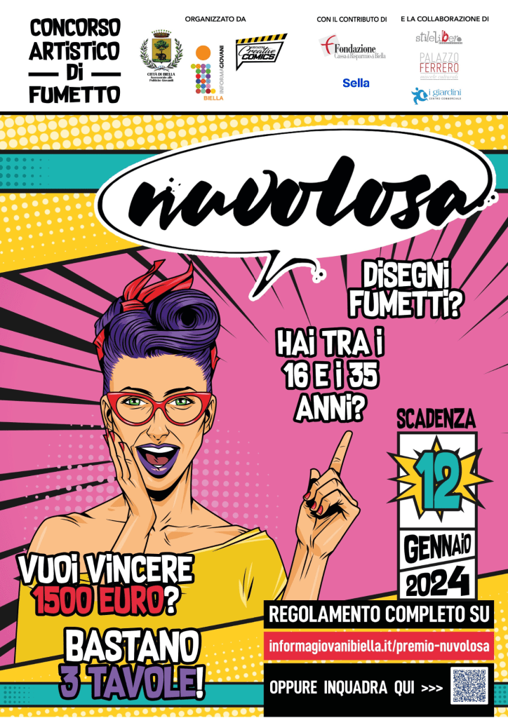 L’Assessorato alle Politiche Giovanili del Comune di Biella, in collaborazione con l’associazione culturale Creativecomics, ha aperto il Concorso Artistico Nazionale rivolto ai giovani tra i 16 e i 35 anni, che prevede interessanti premi in denaro per i vincitori (1.500, 700 e 400 euro; 200 euro per il Premio Sceneggiatura) e la pubblicazione di un catalogo con dieci opere selezionate.