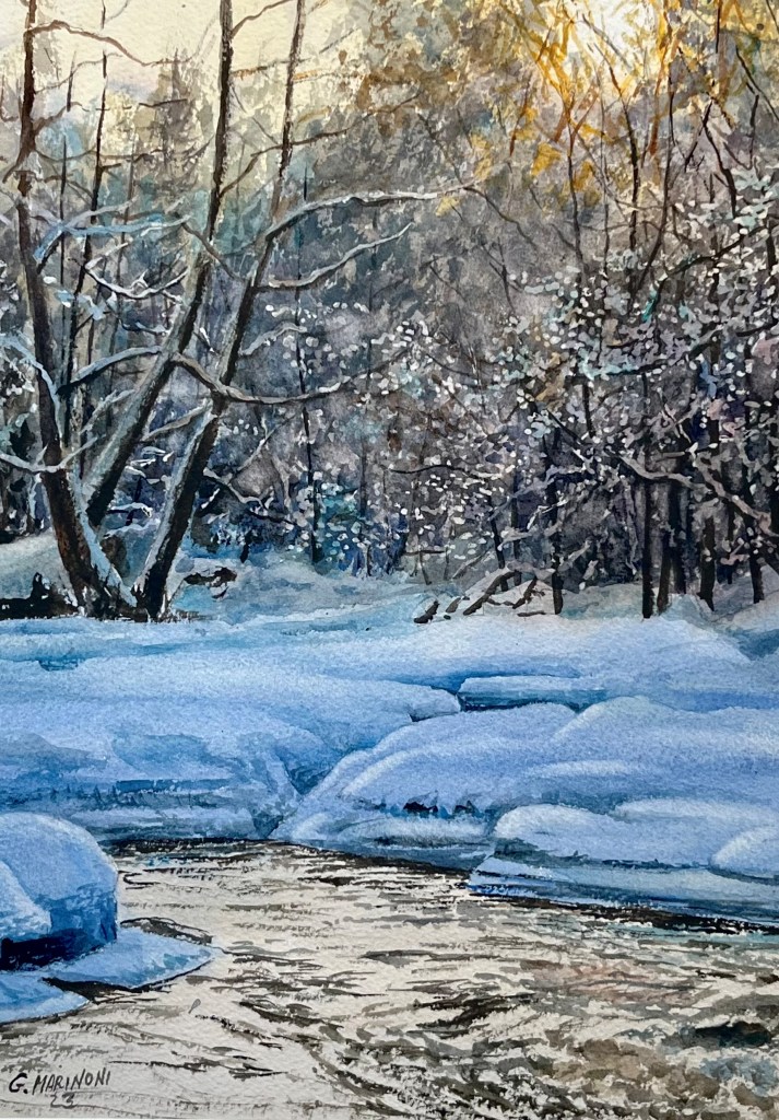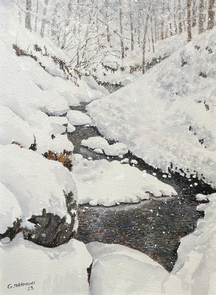 Dopo la mostra dello scorso anno a Sordevolo di stampo paesaggistico al di fuori dell’ambito ‘neve e montagne’ e il successo della mostra primaverile in centro Biella ‘Scorci di vita urbana’ ecco che il vernissage di domenica mattina alle 11 fa rientrare Giorgio Marinoni nel perimetro delle sue tematiche classiche, i paesaggi innevati, ma con un risvolto ancora più specifico : il momento e i particolari di quando la neve si mescola con l’acqua, nel passaggio di stato che è anche metafora dell’esistenza e della trasformazione della propria vita, sempre mutevole eppure sempre unica.