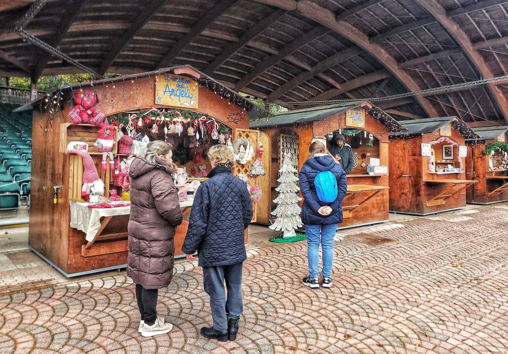 Con una affluenza ancora timida e la novità della pista da pattinaggio ancora in allestimento ( necessita di temperature adeguate che ora sembrano arrivate ) il ‘Mercatino degli Angeli’ è il consueto serpentone di gazebo e casette in legno con manufatti artigianali, enogastronomia e articoli da regalo.
