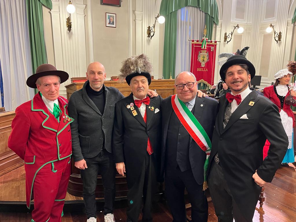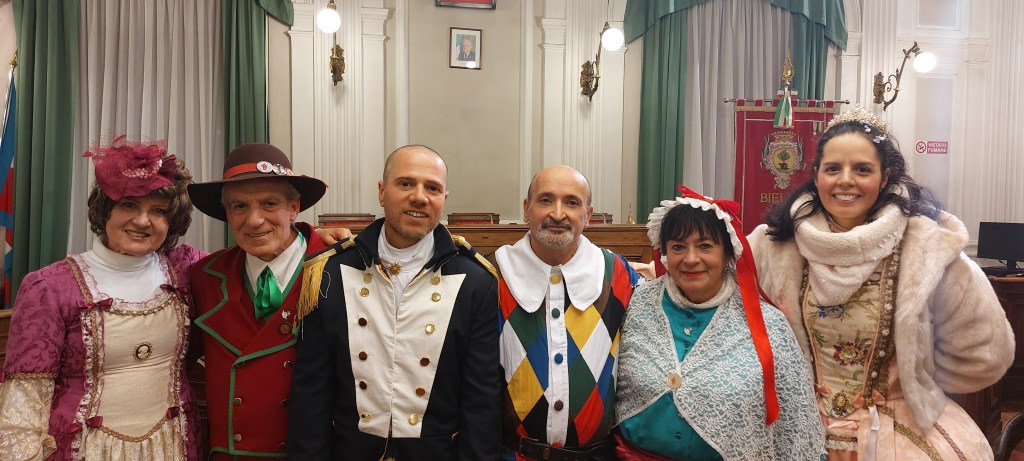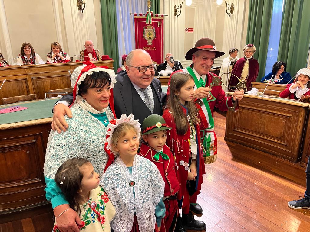 Il sindaco ha ringraziato tutte le maschere venute a Biella oggi e provenienti da Torino (Gianduia e Giacometta); Bergamo (Giopi e Margi, Arlecchino e Brighella); Venezia (Colombina e Rosaura); Savona (Re Cicciulin e Sigua); Santhià (Stevulin e Majutin, lo Stato maggiore Napoleonico); Novara (Re Biscottino, regina Cunetta e la corte); Settimo Torinese (Castellana e la sua corte); Cavaglià (Gianduja e il Generale); Chatillon (i Conti di Chatillon e la loro corte); Verrua Savoia (i Conti Scaglia); Croce Mosso (Ciciareta e seguito); Brandizzo (la Bela Cusotera e il Gran Giardiniere); Borriana (la tinca gobba, Giulia Belli e il conte Amedeo dal Pozzo); Campertogno (Raviccia e Raviciun); San Raffaele Cimena (Madama e Monsù Pelacurdin e il loro seguito); Benna (il principe Ildebrandus e la Bella castellana); Lessona (i Marchesi di Lessona); Pollone (i Marchesi Bobba); San Sebastiano da Po (Al Purtunè e la Marin-a del port); Sant’Anna (Bel Prà ed Erbetta); Occhieppo Inferiore (Pettirosso e Capinera, Duca e Duchessa); Tronzano Vercellese (Riccardino del castello e Pinutina); Guardabosone (Bullo e Bulla); Chiavazza (Cucu e il suo seguito); Biella vernato (il Cunt dal Thes e la bela Ginevra); Biella Barazzetto (Marghè e Lacera); Mongrando (sogno veneziano e seguito); Saluggia (i Conti Mazzetti), Andezzeno (la bella Cardera), Orio Canavese (i Conti di Orio) e Sabbia Valsesia (regina Menga e re Tognu).