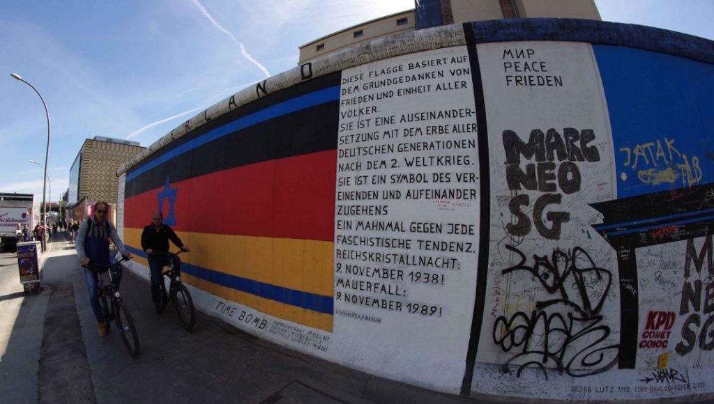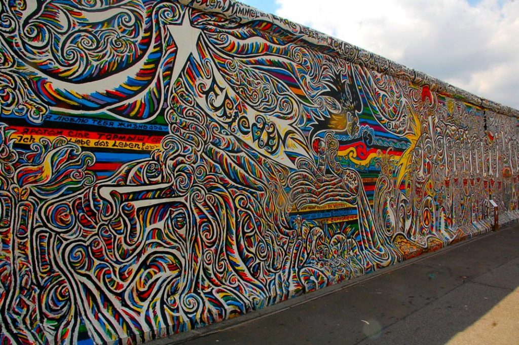 Una tappa obbligata per chi voglia conoscere il contributo della street art al racconto della riunificazione tedesca è l’East Side Gallery, posta tra il ponte Oberbaum e la stazione. All’indomani della caduta del muro, più di cento artisti provenienti da ogni parte del mondo si cimentarono nel raccontare la difficile ma entusiasmante riunificazione delle due Germanie. Tra i tanti graffiti quello senza dubbio più famoso rimane “il bacio fraterno” tra Leonid Brezhnev e Erich Honecker. L’opera, dell’artista russo Dmitri Vrubel, riproduce uno scatto del 1979 in cui i due capi di Stato dell’URSS e della DDR si baciavano a labbra serrate, un rito mutuato dalla tradizione ortodossa che serviva a ribadire la fratellanza socialista delle due nazioni.