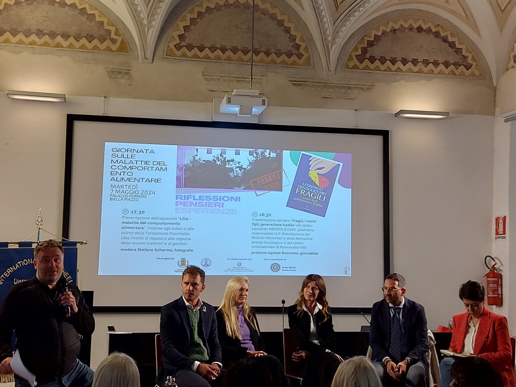 In occasione della Giornata Mondiale delle Malattie Alimentari si è tenuto martedì a partire dalle ore 17.30 un Convegno al tema:” Riflessioni, Pensieri, Esperienze . Malattie del Comportamento Alimentare ” . Ad aprire i lavori come moderatore Stefano Scherma che ha ceduto la parola a un rappresentante del nosocomio cittadino citando quanto sia importante questa problematica tanto è vero che per questa patologia vi è sinergia con il reparto psichiatrico viste le emozioni che l’ individuo può avere. Di seguito si è raccontato del libretto ( qui in foto) dove si parla della problematica. Inoltre si è parlato del lavoro di divulgazione nelle scuole. Centrale il rapporto tra genitori e figli che hanno il compito di stargli vicino. Infine si è fatto una disamina sulla malattia e spiegando quanto sia importante intercettare i soggetti a rischio. Alle ore 18.30 si è presentato il libro ” Fragili, i nostri figli , generazione tradita” scritto dal dottor Leonardo Mendolicchio , psichiatra. La serata si è conclusa con un aperitivo al Bar di Palazzo Ferrero.