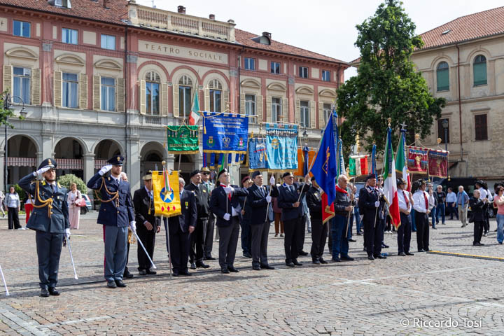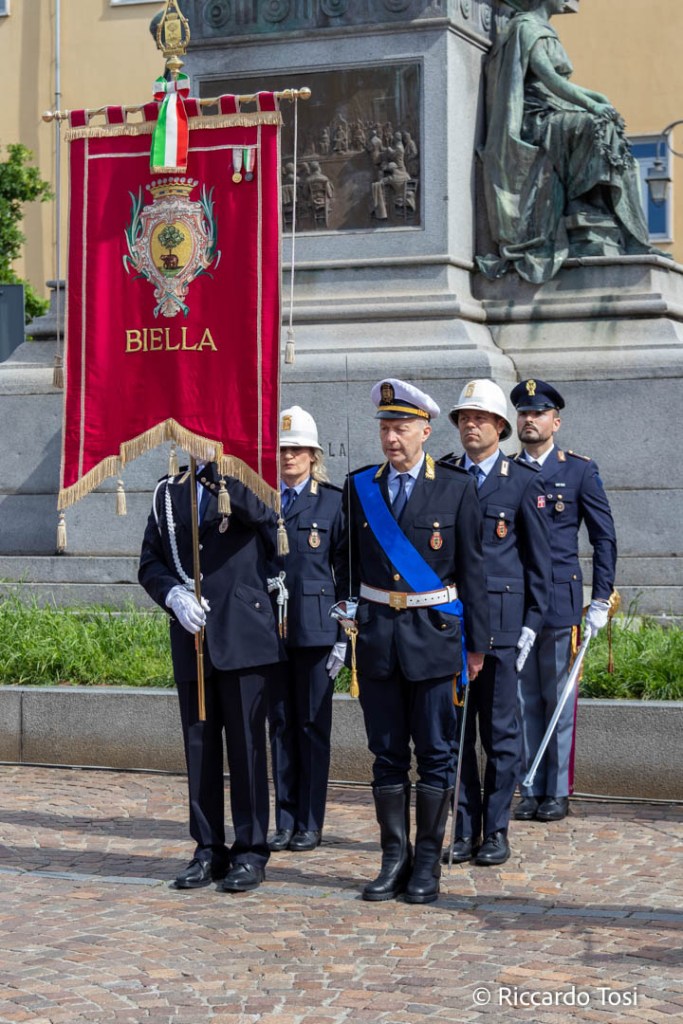 Dopo la deposizione di una corona d’alloro in memoria dei Caduti, si sono svolti gli onori militari, seguiti dall’Alzabandiera, accompagnato dalle note della Banda Musicale “Giuseppe Verdi” di Biella.