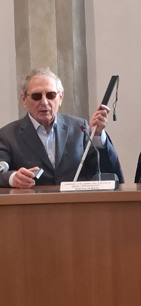 Poi è stato il turno del presidente dell’ Unione Italiana dei Ciechi e degli Ipovedenti Sezione di Biella, che ha espresso la sua gioia per l’iniziativa e ha spiegato che per un cieco o un ipovedente uscire di casa senza accompagnatori è un problema; in seguito ha mostrato il bastone e ne ha illustrato il funzionamento. Ha poi fatto notare che, quando uno perde la vista, ha una certa vergogna a farlo sapere. Ha concluso dicendo che il progetto in oggetto deve essere un inizio e non una fine.