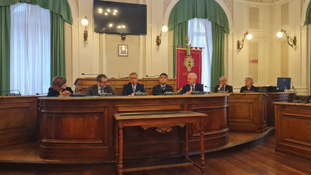 Presentazione della convenzione con il Ministero della Giustizia per lavori di ristrutturazione di palazzo Oropa e del palazzo del Tribunale di Biella con Marzio Olivero , Andrea Delmastro , Cristiano Franceschini , Amedeo Paraggio , Livia Caldesi .