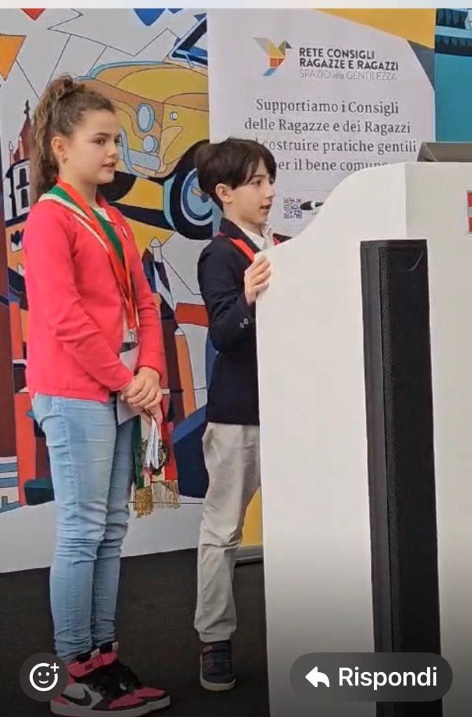 Il primo Consiglio Comunale dei Ragazzi chiamato a intervenire è proprio quello di Biella. Tocca a Giulia, 10 anni, V primaria della scuola XXV Aprile, rompere il ghiaccio! Giulia si presenta e presenta Alessandro, 10 anni anch’egli, IV primaria scuola De Amicis. Presenta i tutor, come le è stato richiesto: le maestre Giorgia Aiazzone, Pina Imbriaco, Monica Maruca (alle quali vanno tanti grazie di cuore) e l’assessore Livia Caldesi.