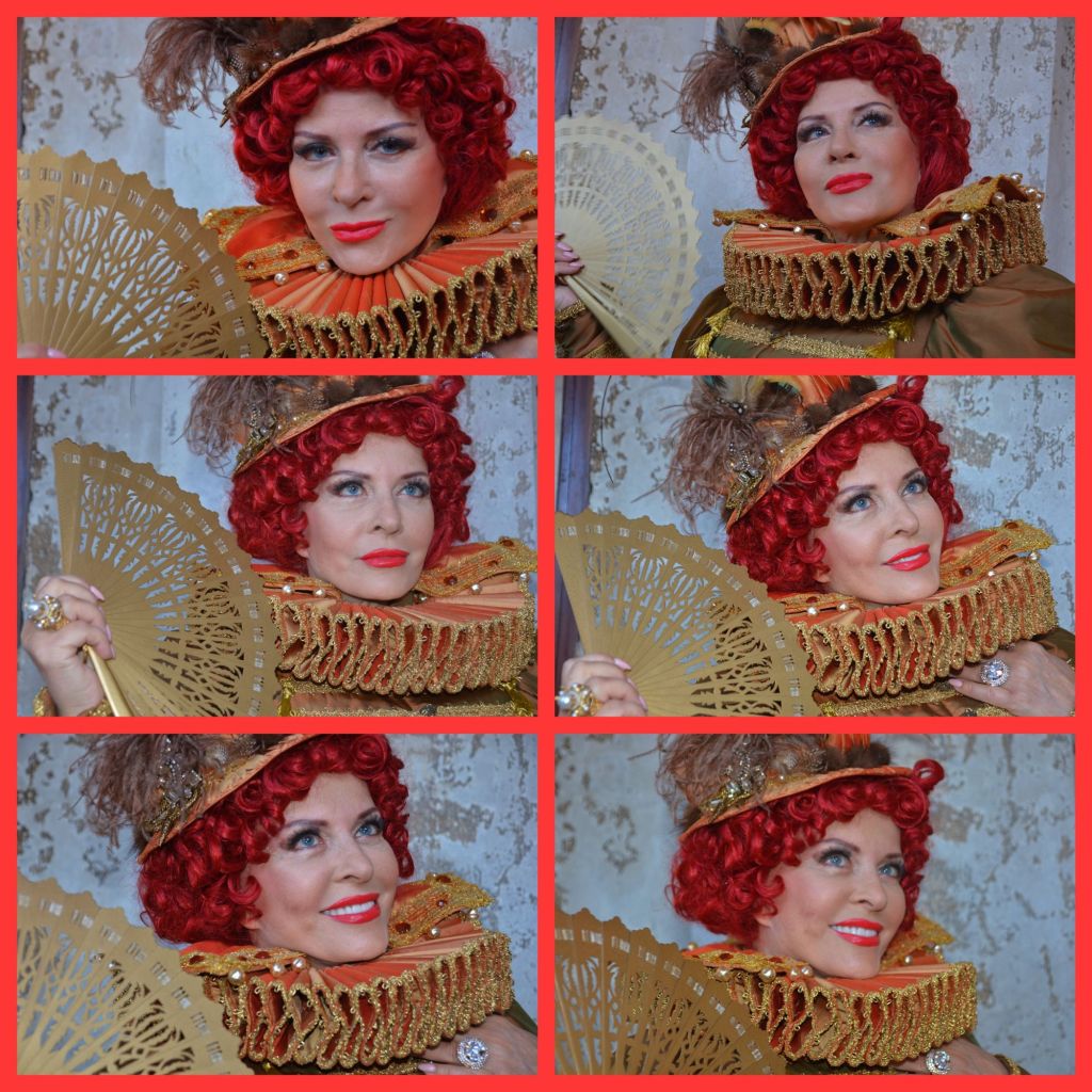 Capelli rossi, cappellino riccamente decorato e piumato, ventaglio in tono armonico all’abito, costume finemente di plissè ampiamente cadente a terra con ricami e splendide decorazioni, “giorgera” d’epoca spiccatamente elegante, perfettamente il tutto intonato a quei tempi in cui a Venezia si udivano solo i tacchetti delle scarpe, il ticchettare degli zoccoletti sulla pietra d’Istria, che pochissimi conoscere il motivo per cui si scelse quel tipo di pietra particolare, solo lo scivolare silente delle gondole, che accarezzavano i canali, distaccandole dalle mure nelle virate ad angolo con il tradizionale colpo di gamba, quella visione era assolutamente premonitrice che i mie scatti immortalassero davvero una star, infatti si tratta di Isabella Rich, modella sui VIP magazines internazionali :