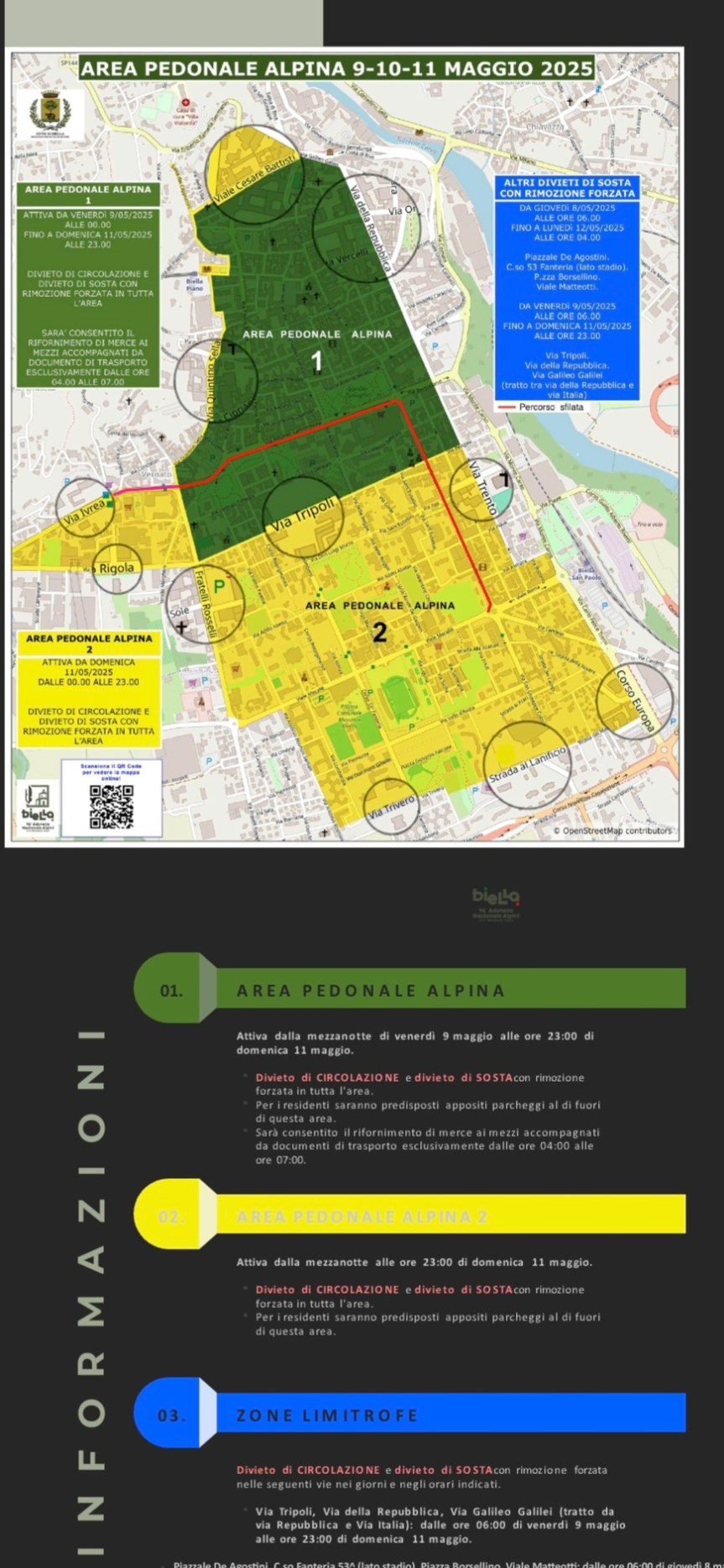 Area verde – Area Pedonale Alpina 1 – Area compresa fra Viale Cesare Battisti, Via Galileo Galilei, Via Repubblica, Via Tripoli, Via Q. Sella (nelle strade citate si potrà transitare). Quest’area sarà attiva da venerdì 9 maggio 2025 alle 00:00 fino a domenica 11 maggio alle 23:00. Durante i tre giorni di manifestazione non sarà possibile circolare, sostare e spostare i veicoli dalle aree di sosta interne o autorimesse e garage.