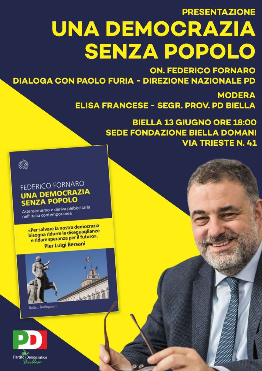Il 13 giugno 2025, presso il salone della Fondazione Biella Domani in via Trieste 41, alle ore 18, presenteremo il libro dell’on. Federico Fornaro dal titolo “Una democrazia senza popolo”, uno spaccato d’attualità sulla crisi della democrazia e l’astensionismo.