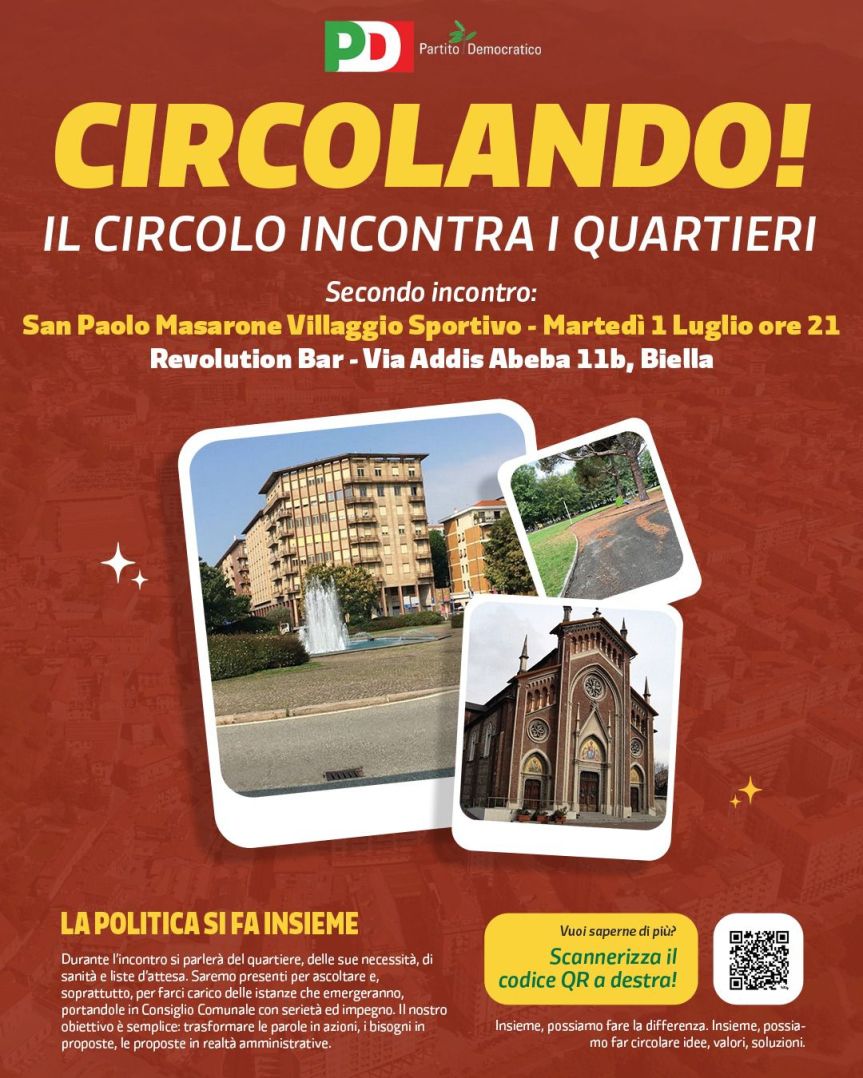 Dopo il successo del primo incontro al Villaggio Lamarmora, Circolando!, l’iniziativa del Circolo PD di Biella per incontrare i quartieri, ci porterà nel quartiere San Paolo Masarone Villaggio Sportivo, che incontreremo il 1 luglio alle 21 al Revolution Bar di Via Addis Abeba 11 b.