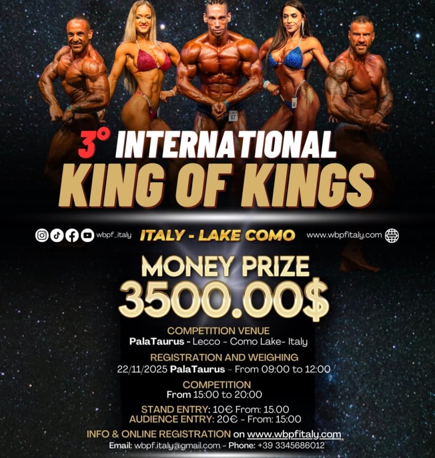 #sport#L’evento International King of Kings WBPF 2025 si terrà il 22 novembre 2025 al Palarogeno di Rogeno, Italia. Per tutti i bodybuilder!